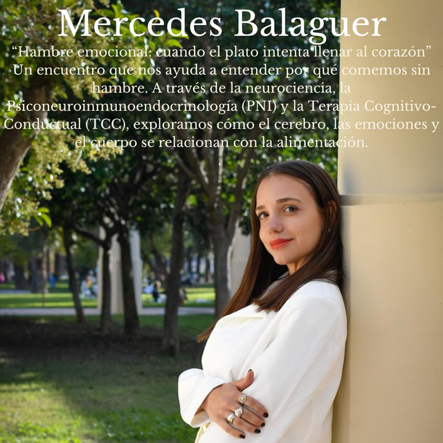 🧠 Charla con Mercedes Balaguer – “Hambre emocional: cuando el plato intenta llenar al corazón” Un encuentro que nos ayuda a entender por qué comemos sin hambre. A través de la neurociencia, la Psiconeuroinmunoendocrinología (PNI) y la Terapia Cognitivo-Conductual (TCC), exploramos cómo el cerebro, las emociones y el cuerpo se relacionan con la alimentación.